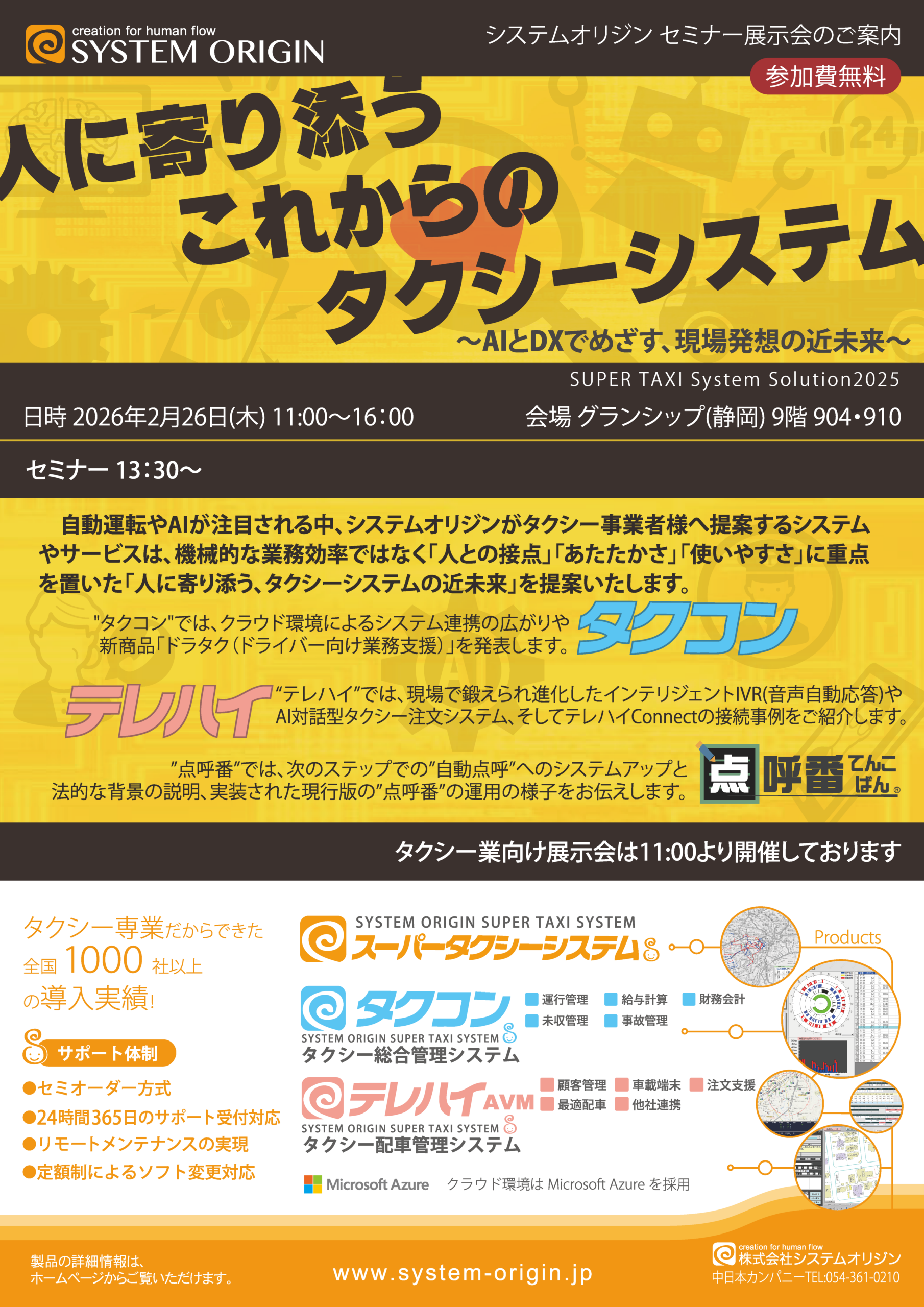 今回はテーマを「人に寄り添う これからの タクシーシステム」と題し、自動運転やAIが注目される中、システムオリジンがタクシー事業者様へ提案するシステムやサービスは、機械的な業務効率ではなく「人との接点」「あたたかさ」「使いやすさ」に重点を置いた「人に寄り添う、タクシーシステムの近未来」を提案いたします。